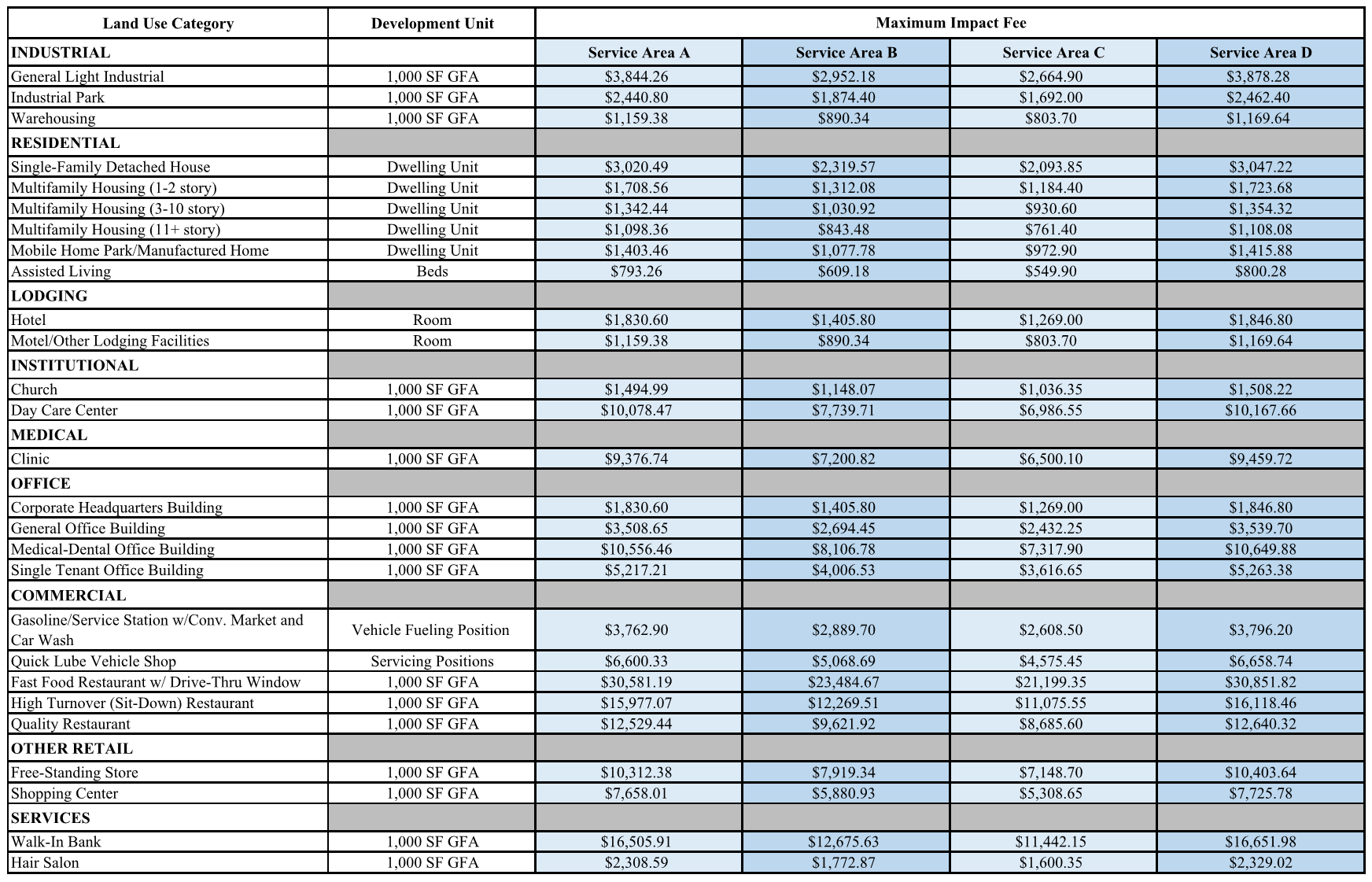 Roadway Impact Fees are calculated based on projected traffic generation, land use type, and service area (A, B, C, and D). Service area E has no roadway Impact Fees.