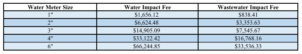 Water and Wastewater Impact Fees are determined by the size of the meter and are the same in all service areas. Water fees are assessed for both domestic and irrigation meters, and wastewater fees are assessed for domestic meters only.
