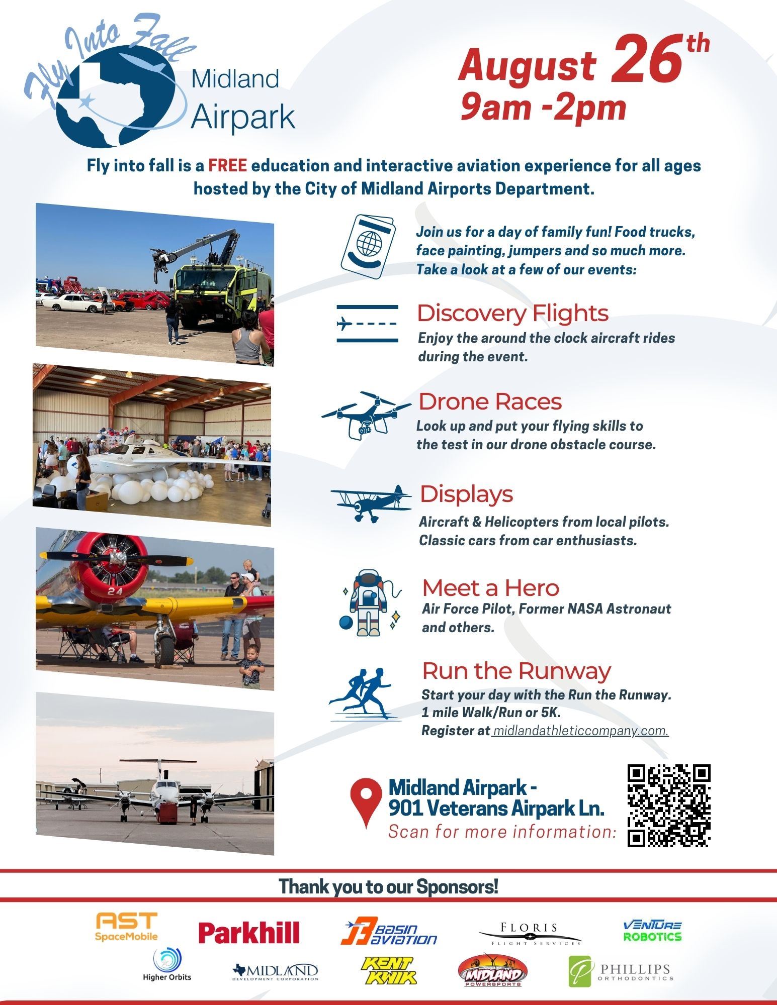 Take Off at 7:50 AM for the 1-mile Run/Walk or 5k, Run for the Runway, sponsored by Midland Athletic Company. You can register at 8-26 | Run the Runway – Midland Athletic Company or get more run information at [http://http:midlandathleticcompany.com/]midlandathleticcompany.com.